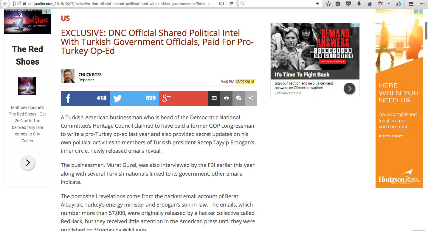Amerikan eski başkan yardımcılarından Dick Cheney’in danışmanlarından 20 yıllık gazeteci Neil Patel tarafından 2010 yılında kurulan ve Amerika’nın en hızlı büyüyen online haber sitelerinden biri olan Daily Caller, Türk işadamı Murat Güzel’in Türk hükümetiyle istihbarat paylaştığı ve Türkiye lehine yazı yazdırmak için Kongre üyelerine para ödediğini iddia etti. Daily Caller için yazan Chuck Ross’un Enerji Bakanı Berat Albayrak’ın hacklenen emaillerine atıfla yazdığı yazıya karşılık Güzel, yaptığı açıklamada e-maillerde geçen yazışmasının arkadaşlık ve doğduğu ülkeye sadakatının göstergesi olduğunu söyledi. Ross yazısında geçen FBI tarafından soruşturulduğu iddiasını ise İşadamı Güzel reddetti. Güzel, bu bilgilerin Daily Caller'a FETÖ'cüler tarafından verildiğini savunurken, kendisinin FETÖ'cüler tarafından yüzlerce Tweet ile hedef haline getirildiğini söyledi. Güzel’in, Türkiye hükümeti ile istihbarat paylaştığı ve Kongre üyesi Dan Burton’a Türkiye ile ilgili yazı yazdırdığı iddialarını içeren Daily Caller’daki yazının Türkçe içeriği şöyle: