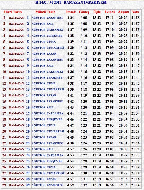 Türklerin yoğun olarak yaşadıkları sehilerlerde Diyanet İşleri Başkanlığı çizelgesine göre imsakiyeler şöyle.
