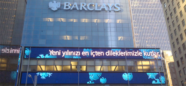 Turizm Bakanlığı'nın Türkiye ile ilgili outdoor reklamlarına alışkın olan New Yorklular, bu kez farklı büyük şirketlerin Türkiye ile ilgili kampanyalarına da tanıklık ediyor. New York'ta 7. Avenue'de yer alan İngiliz finans devi Barclays'in binasının dış cephesine yazılan Türkçe yeni yıl mesajı dikkat çekti. ABD merkez binasının dış cephesinde yaptığı reklam çalışmaları ile dikkat çeken Barclays, İngiliz Premier Lig sponsorluğunun yanı sıra NBA takımlarından New Jersey Nets'in maçlarını oynadığı Barclays Center stadına da destek veriyor. Sadece Türkçe ve Almanca yeni yıl mesajlarının yer aldığı binanın reklam panolarında, ''Yeni yılınızı en içten dileklerimizle kutlar, esenlikler dileriz'' denildi.